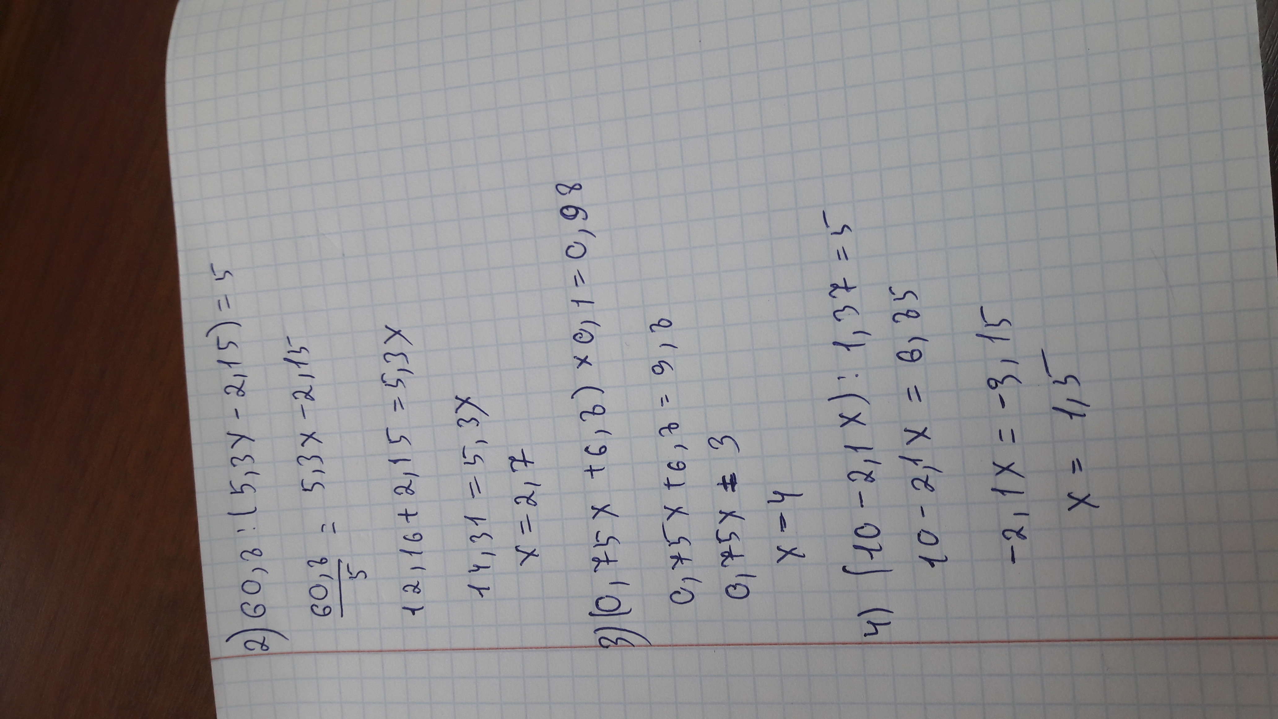 помогите пожалуста решить уравнение 1) (0,9х+4,55)*0,3=1,5 2)60,8:(5,3x-2,15)=5 3) (0,75x+6,8)*0,1=0,98 4) (10- 2,1x):1,37=5