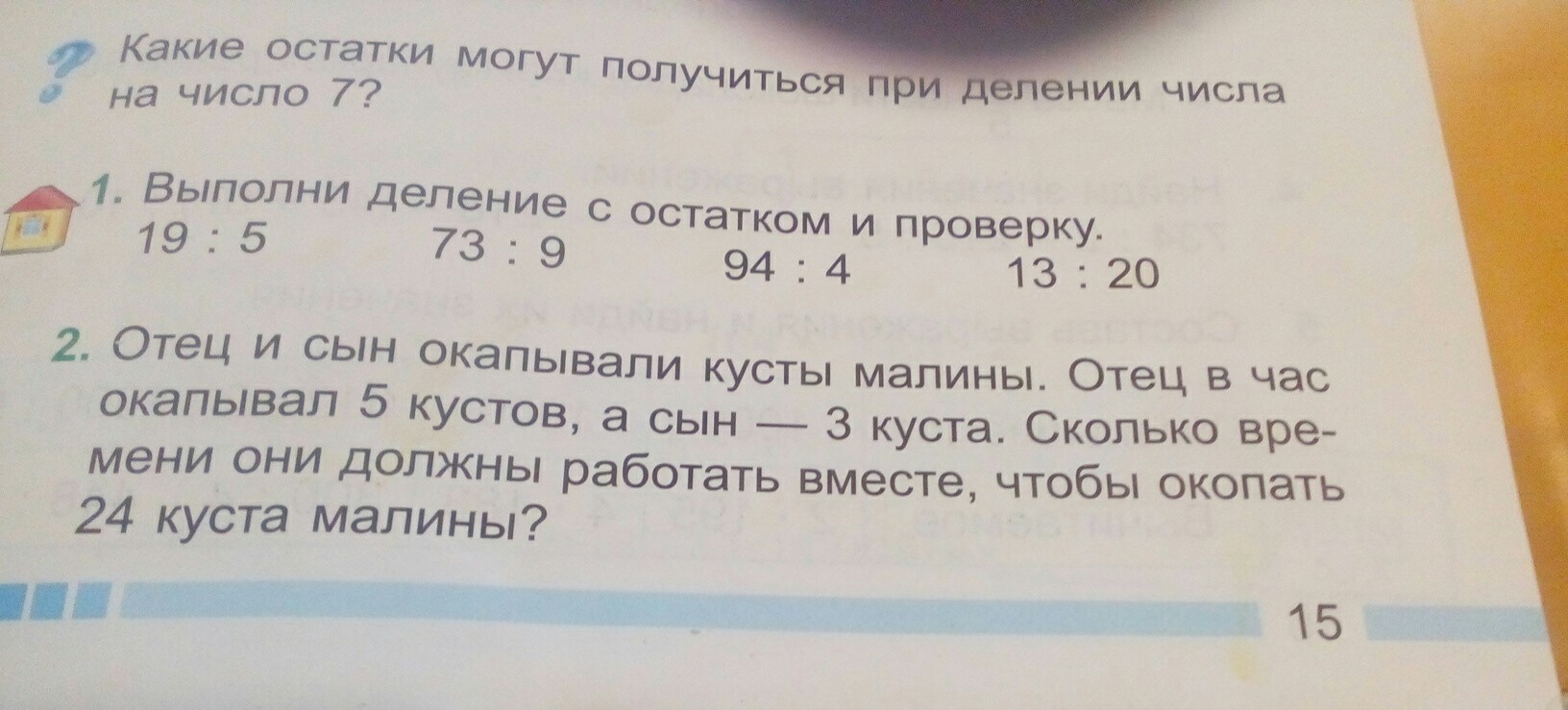 1). 5+3=8(кустов)- окапывают папа и сын вместе; 2). 24:8=3(часа). Ответ: 3 часа необходимо им для окапывания малины, если будут работать вместе.