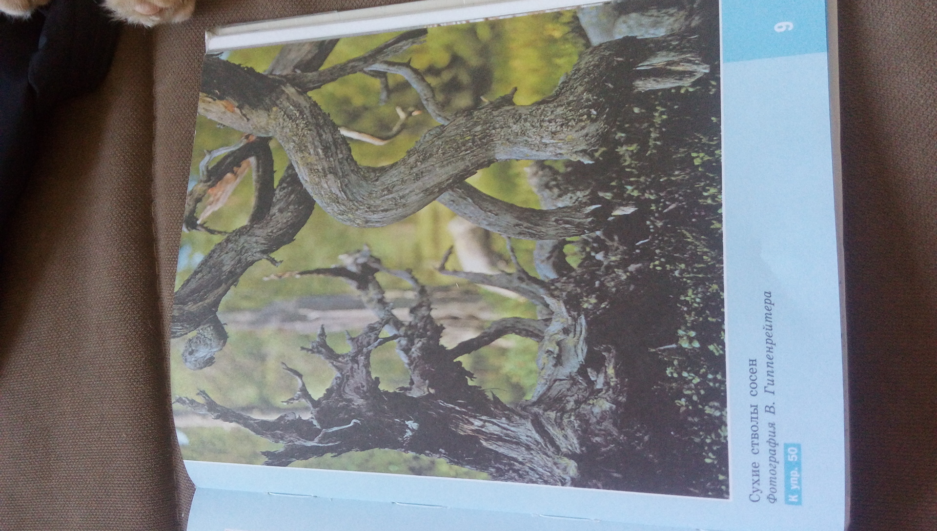 На фотографии «Сухие стволы сосен» запечатлены сосны уже давно умершие. Их стволы высохли и почернели от времени. От одной сосны остался только искореженный пень. Другие стволы кривые, изогнутые. Вокруг них также нет жизни: не пробивается из-под земли ни одна травинка. Лишь за стволами господствует жизнь. Там зеленеет густая трава, растут другие деревья.