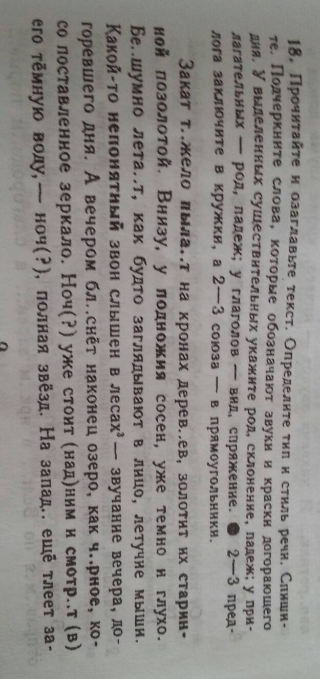 Закат тяжело пылает на кронах деревьев, золотит их старинной позолотой... Бесшумно летает,... А вечером блеснёт наконец озеро, как чёрное... Ночь уже стоит над ним и смотрит в его темную воду,- ночь , полна звезд . На западе... Буквы вставили, не забудь про 3 в конце предложения- это морфологический разбор слова(как части речи)... Остальное все-решаемо...