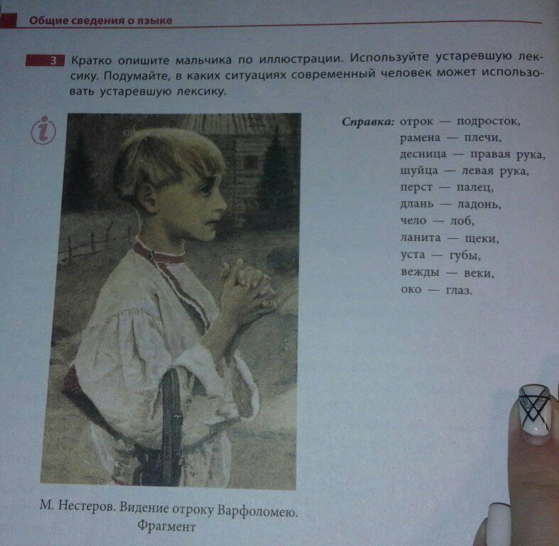 На картине изображен отрок, персты десницы и шуйцы которого переплетены между собой. Очи отрока смотрят беспокойно и тревожно. Уста его сжаты. Ланиты его не румяные, а белесые. Сам он весь бледный. Быть может, он с ужасом на что-то или кого-то смотрит и просит иль молится.
