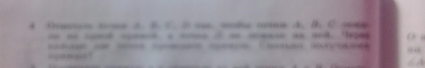 отметьте точки А,B,C,D так чтобы точки А В С лежали на одной прямой а точка D не лежала на ней.Через каждые две точки проведите прямую