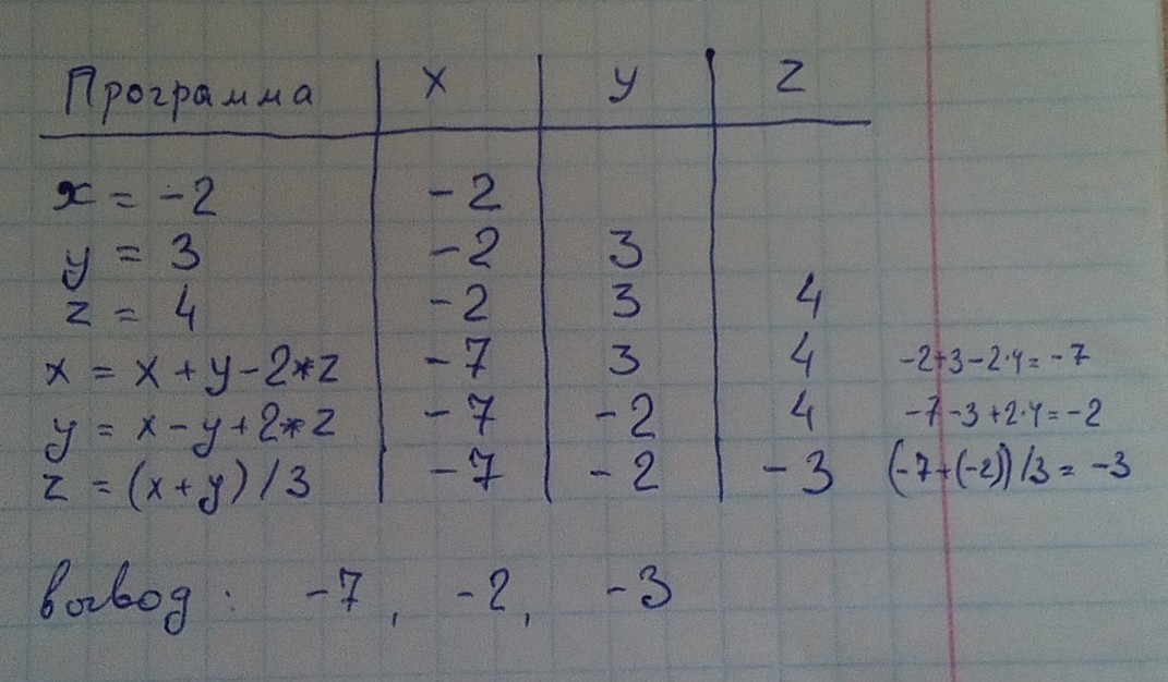 Определить, какие значения x, y, z будут выведены после выполнения фрагмента программы на алгоритмическом языке.