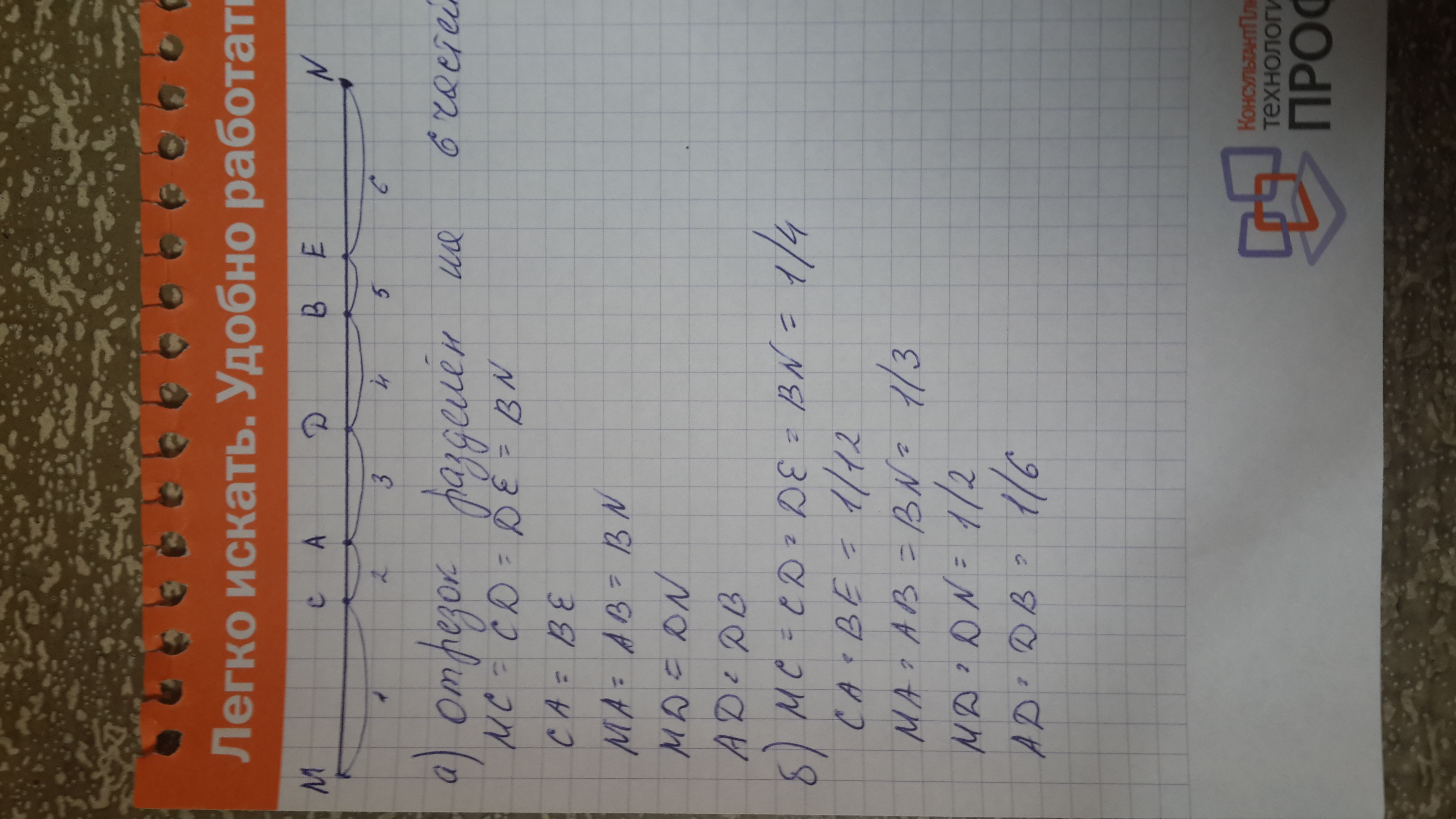 б) МС=CD=DE=BN=1/4, CA=BE=1/12, MA=AB=BN=1/3, MD=DN=1/2, AD=DB=1/6