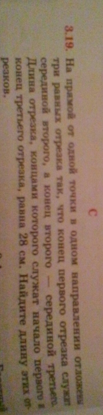 третий отрезок равен 28 см, так как началом первого и третьего отрезка является одна точка, тогда второй отрезок равен 28/2=14 см