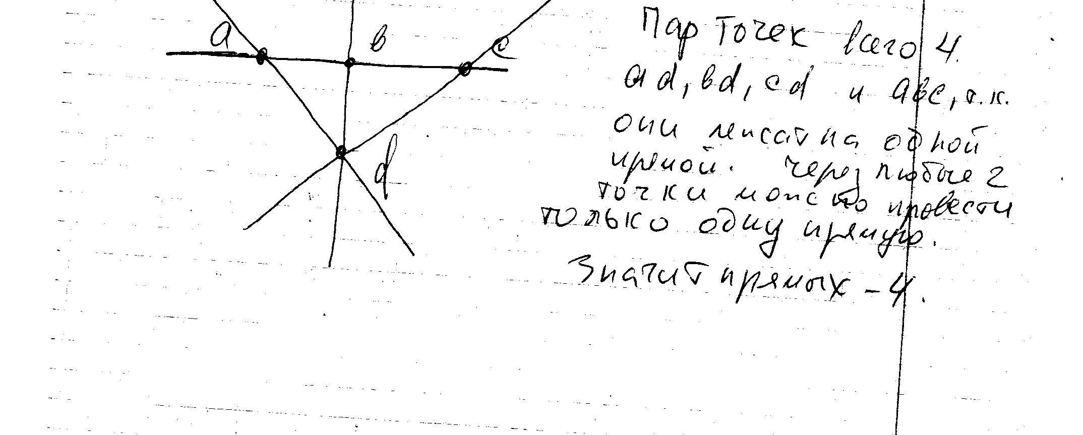 отметьте точки a b c d так чтобы точки a b c лежали на одной прямой а точка d не лежала на ней через каждые две точки проведите прямую сколько получилось прямых
