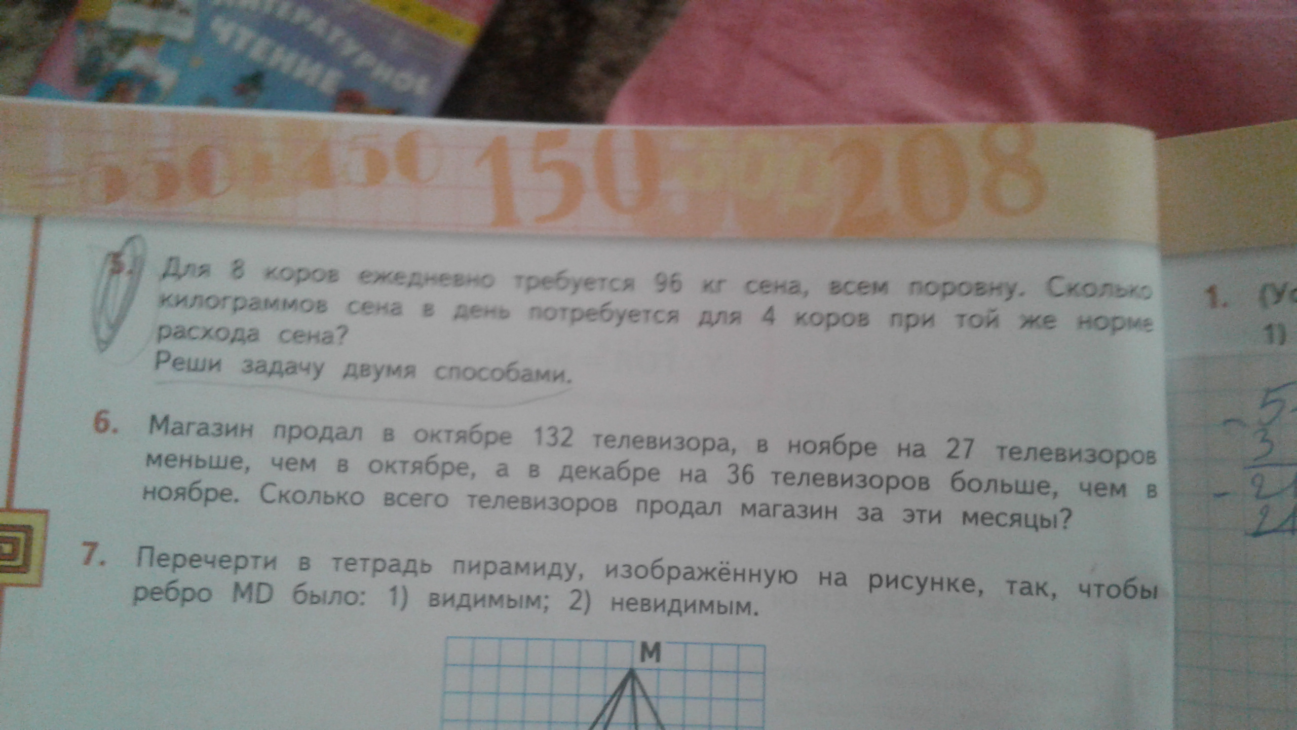 Мы находим во сколько раз уменьшилось количество коров, так как во столько же раз уменьшилось количество и съедаемого ими сена. Разделив 8 коров которые съедают 96 кг на 4 мы получили что количество съедаемого сена уменьшилось в два раза, а значит делим количество сена съеденное 8 коровами на 2.