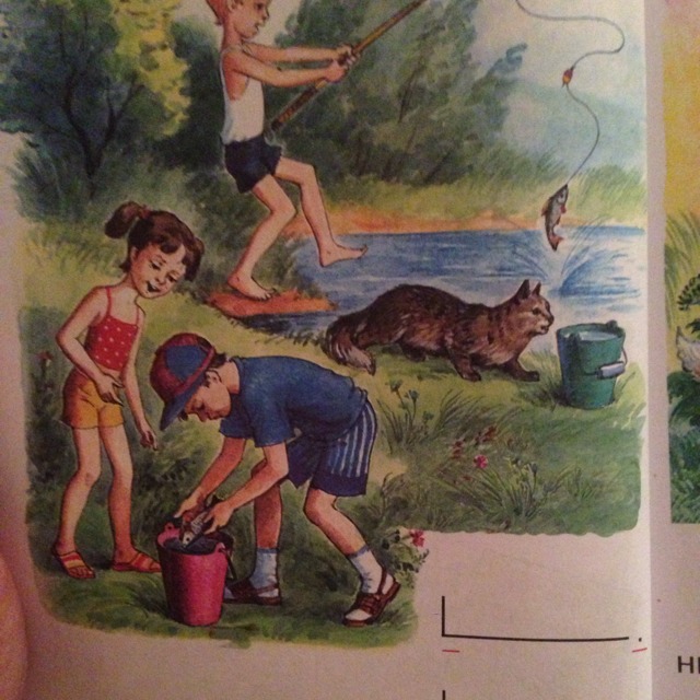 Было жаркое лето. Мой брат Петя ловил рыбу. А я со своей сестрой Машей внимательно разглядывали рыб, у них есть чешуя и они очень большие. Наша кошка Рыжик пыталась поймать рыбу. Наш брат поймал еще одну рыбу! Он отличный рыболов!