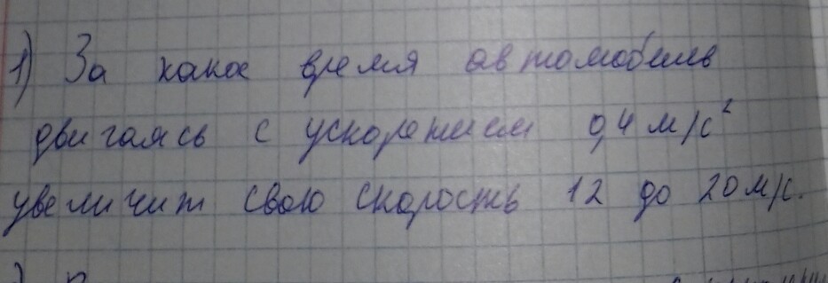 За какое время автомобиль двигаясь с ускорением 0,4м/с увеличит свою скорость 12 до 20 м/с
