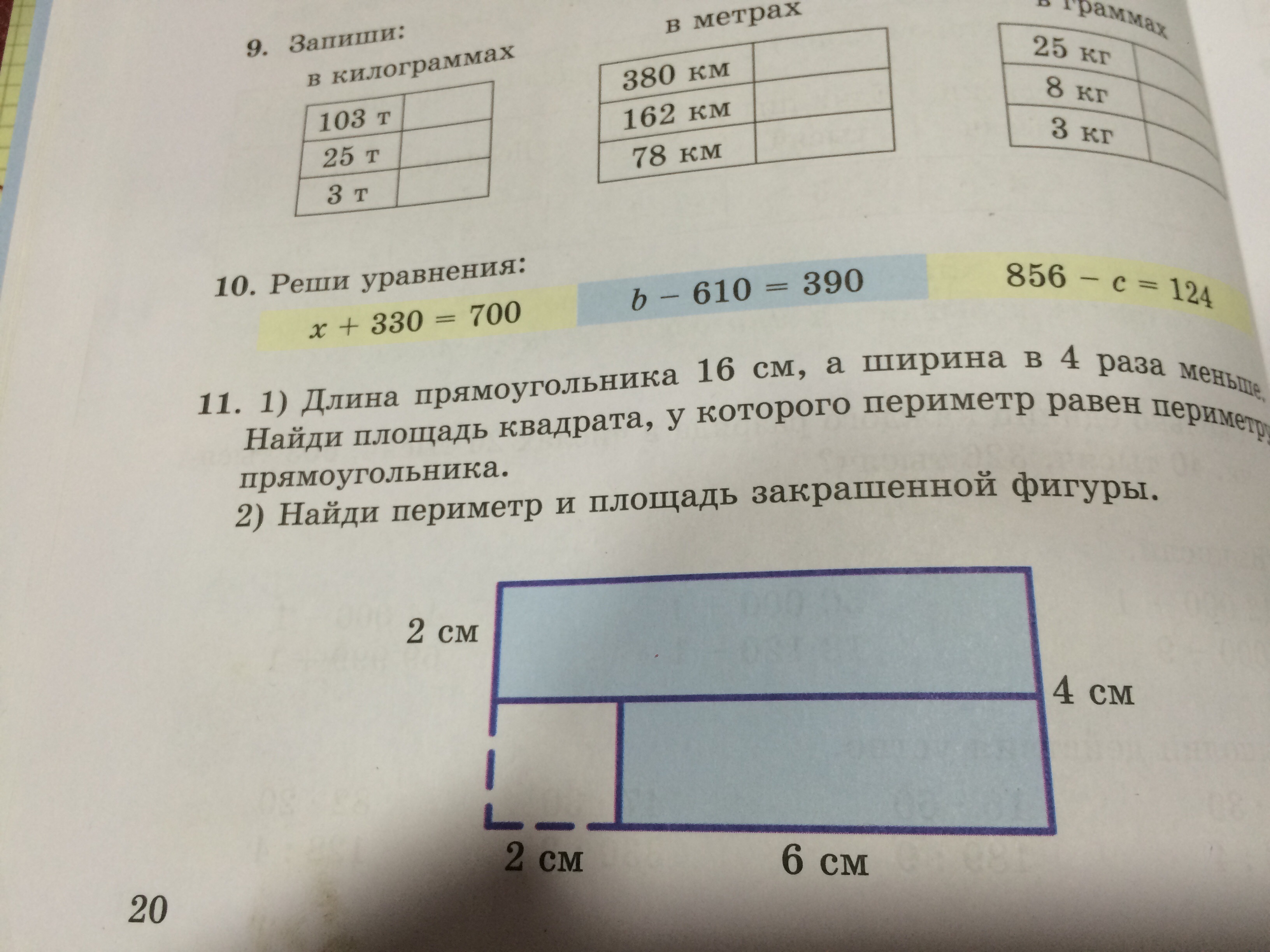 1) P=16*2+(16:4)*2=32+8=40 СТОРОНА КВАДРАТА 40:4=10 Его площадь S=10*10=100 2) Р=6*2+4*2=20 S=4*6 - 2*2 =20