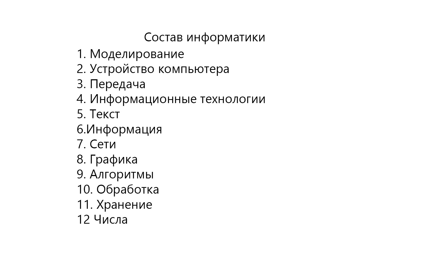 Составте схему состав информатики по ключевым словам:1 Моделирование.2 устройство компьютера.3 передача.4 информационные технологии.5 текст.6 информация.7 сети.8 графика.9 алгоритмизация.10 обработка.11 хранение.12 число