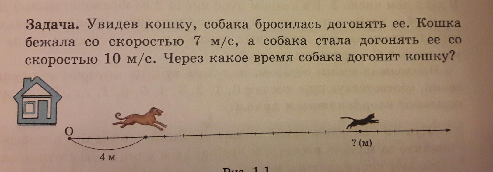 Увидев кошку собака бросилась догонять ее. Кошка бежала со скоростью 7 м/с, а собака стала догонять ее со скоростью 10 м/с. Через какое время собака догонит кошку?