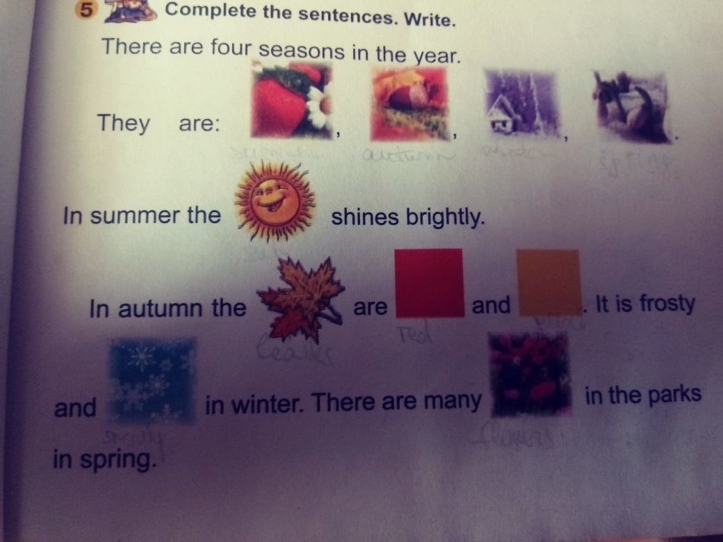 3 in autumn leaves are red and yellow 4.it is frostly and snowflakes in winter
