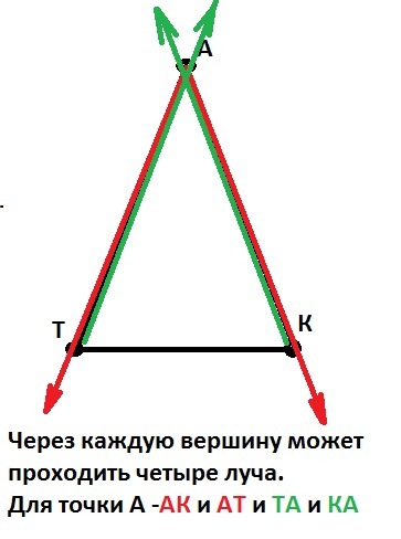 Постройте в тетради точки A, K и T, не лежащие на одной прямой . Через каждые две точки проведите прямую . Сколько различных лучей с началом в этих точках получилось ?