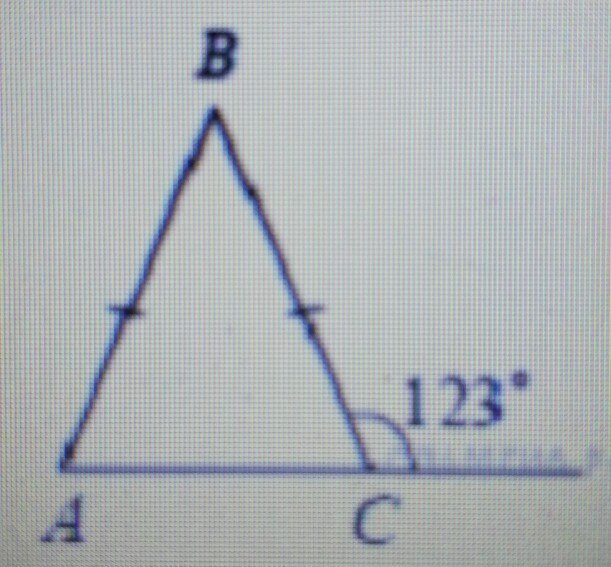 180-123=57. Это угол ВСА, т.к. АВС равнобедренный, угол ВСА=углу ВАС. Сумма углов треугольника =180, получается, 180-(57+57)= 76. Ответ 76.