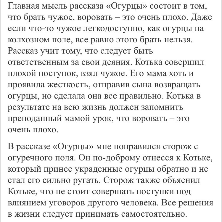 Главная мысль рассказа «Огурцы» состоит в том, что брать чужое, воровать – это очень плохо. Даже если что-то чужое легкодоступно, как огурцы на колхозном поле, все равно этого брать нельзя. Рассказ учит тому, что следует быть ответственным за свои деяния. Котька совершил плохой поступок, взял чужое. Его мама хоть и проявила жесткость, отправив сына возвращать огурцы, но сделала она все правильно. Котька в результате на всю жизнь должен запомнить преподанный мамой урок, что воровать – это очень плохо.