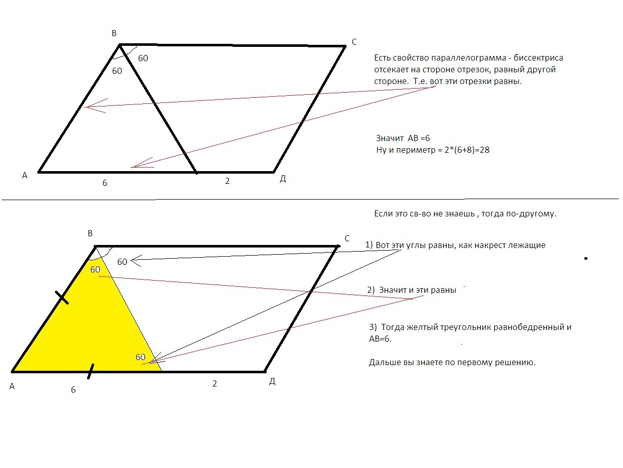 В параллелограмме ABCD угол B равен 120 "градусов" и биссектриса этого угла делит сторону AD на отрезки AE=6 см и DE= 2 см. Найти периметр параллелограмма. (P.S. Помогие пожалуйста срочно)