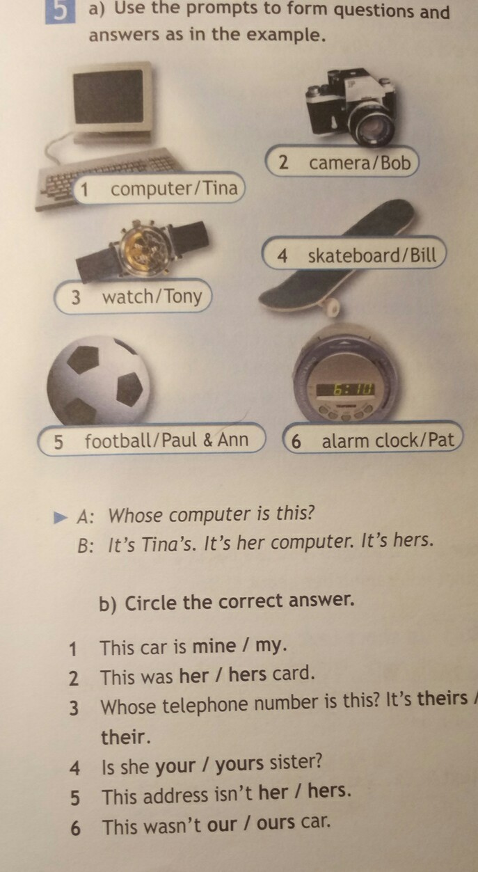 b. 1. mone; 2. her; 3. theirs; 4. your; 5. hers; 6. our.