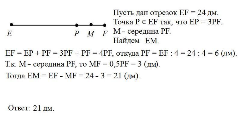 точка P лежит на отрезке EF, равном 24 дм.Отрезок EP в 3 раза больше отрезка PF. Найди расстояние от середины отрезка PF до точки E