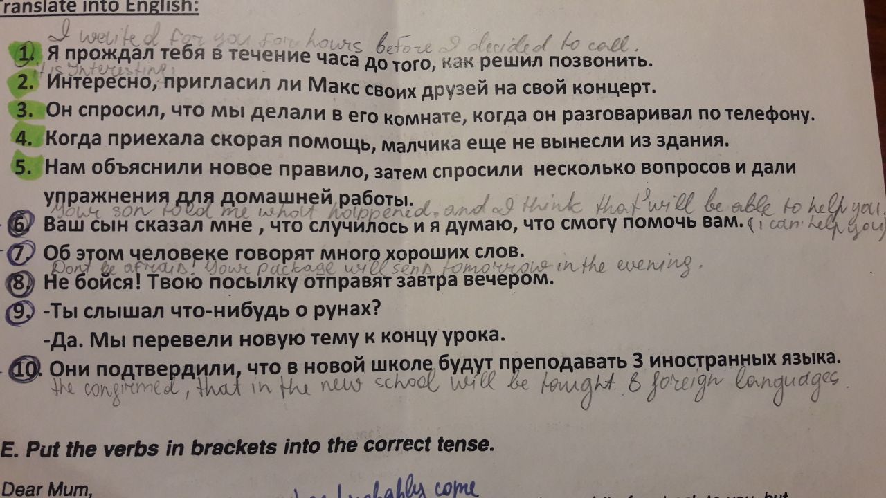 1 I had been waiting for you for an hour before I decided to give you a call 2 I wonder whether Max had invited his friends to his concert 3 He asked what we had been doing in his room when he was talking on the phone 4 When the ambulance arrived, the boy hadn’t been taken out of the building yet. 5 A new rule was explained to us; then we were asked a few questions and given some exercises for homework 6 Your son told me about what had happened and I think that I can help you. 7 Many good words are spoken about this man 8 Don’t worry! Your parcel will be sent tomorrow evening 9 – Have you heard anything about the runes? -- Yes, we had translated a new topic by the end of the lesson 10 It has been confirmed that three foreign languages will be taught at the new school