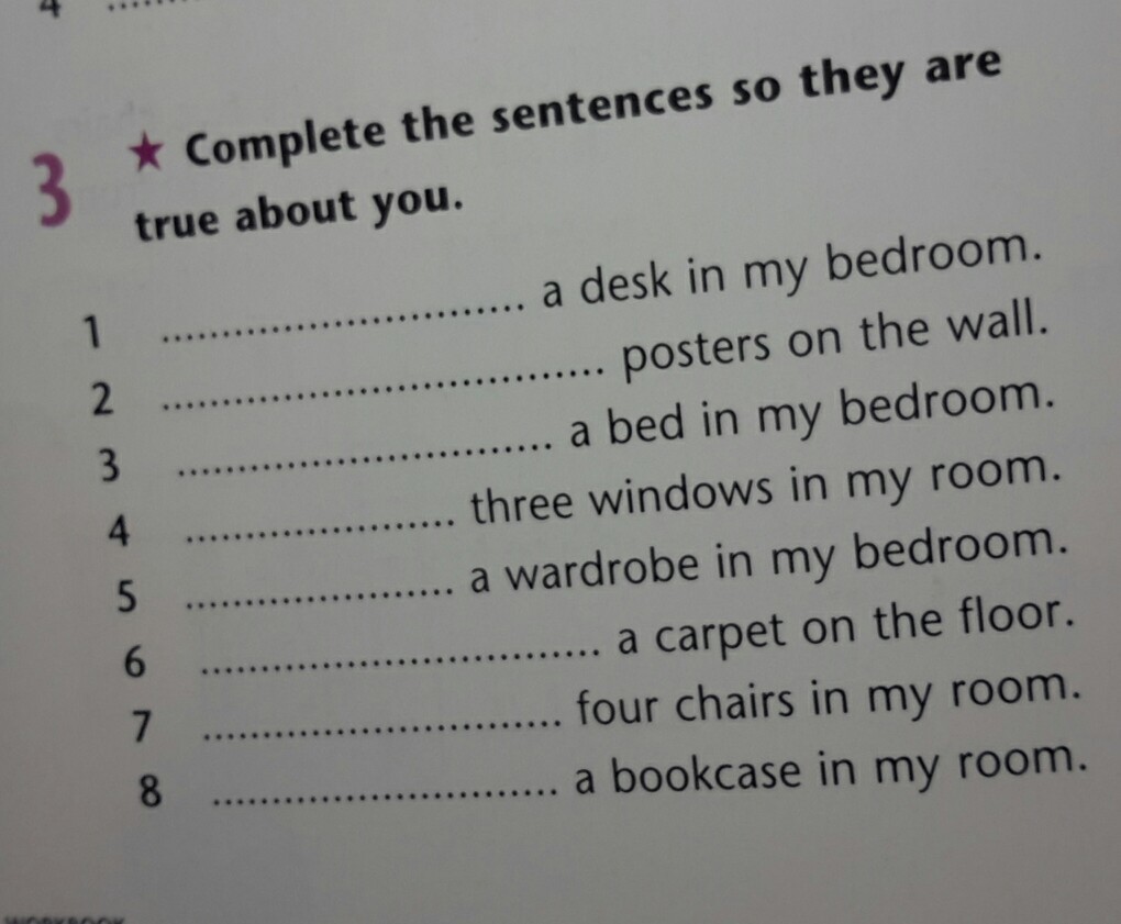 задача написать есть ли у тебя в комнате рабочий стол, плакаты на стенах, кровать, 3 окна, гардероб, ковер на полу, 4 стула и книжный шкаф. если есть: I have, если нет- I have not и дальше переписываешь остальную часть предложения, например (это лично у меня, у тебя не знаю): I have a desk in my bedroom.