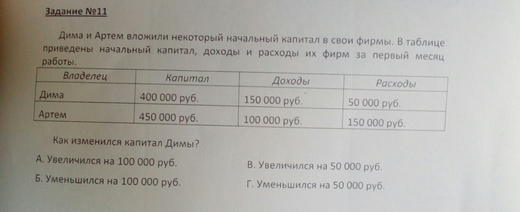 Ответ А. Так как у Димы вначале было 400.000 руб, его доход составлял 150.000, расходы 50.000р