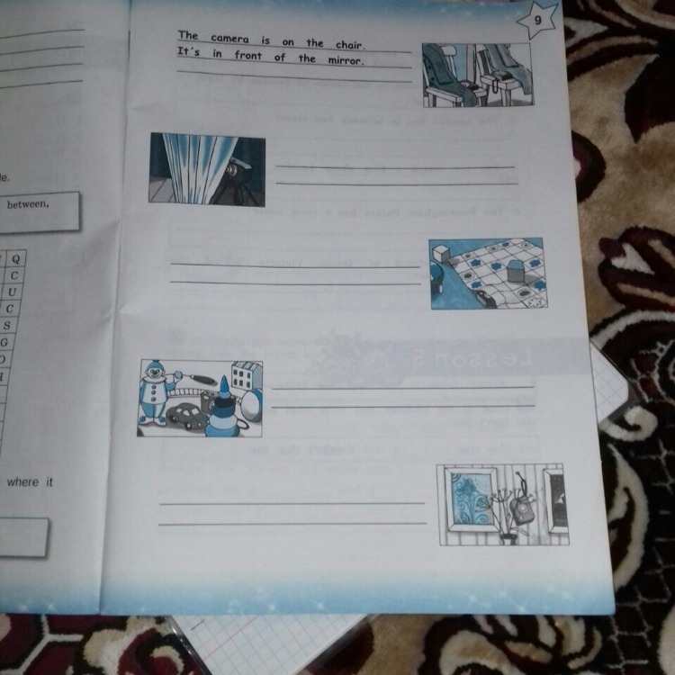 Can you see the camera in the pictures. Write where it is. Use the words from ex. 1 and the box.