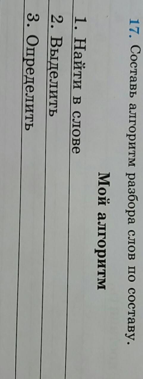 Составь алгоритм разбора слов по составу.....мой алгоритм........1)найти в слове2)выделить3)определить