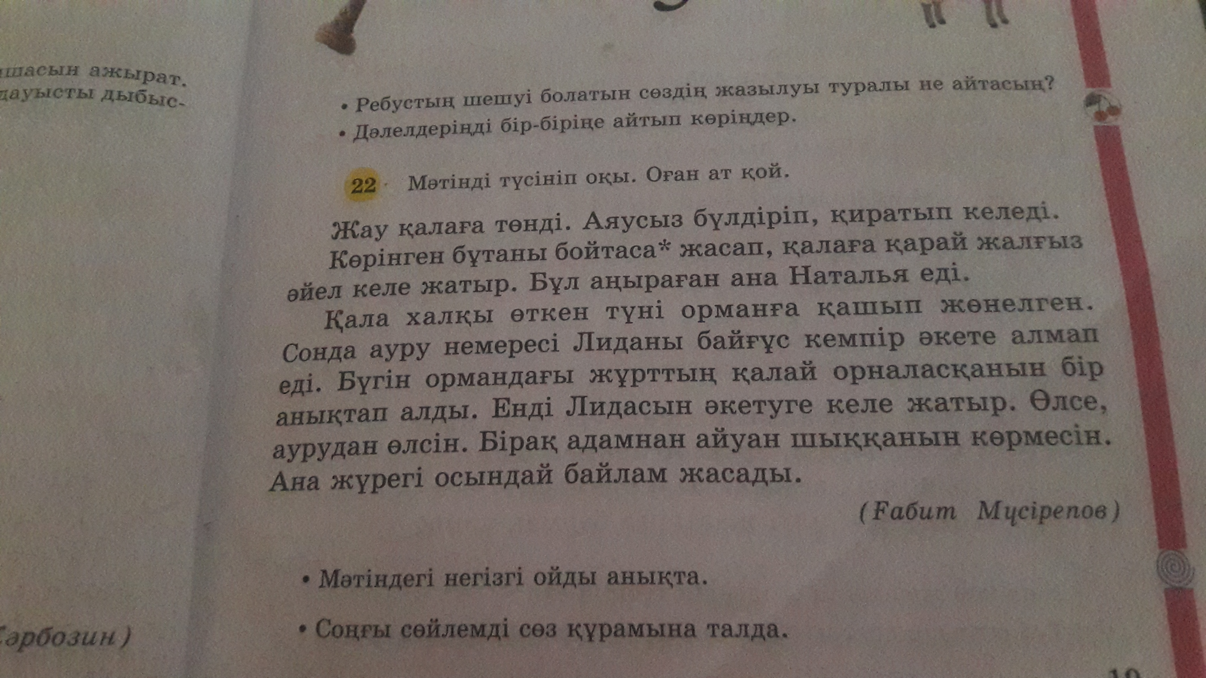 Мəтінді түсініп оқы.Оған ат қой. ●Мəтіндегі негізгі анықта. ●Соңғы Сөйлемді сөз құрамына талда.