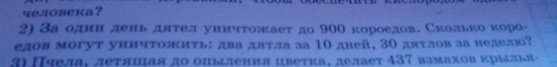 1) 900+900= 1800(короедов) - уничтожают два дятла за 1 день