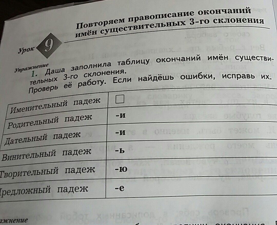 даша заполнила таблицу окончаний имён сеществительных 3-го склонения проверь её работу если найдёш ошибки исправь их. И.п.нулевое окончание Р.п.и Д.п.и В.п.ь Т.п.ю П.п.е