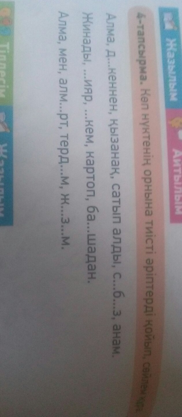 Анам дүкеннен алма, сәбіз, қызанақ сатып алды. Әкем бақшадан қияр, картоп жинады.
