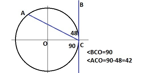 Через точку C окружности с центром О проведены касательная СВ и хорда СА, угол А С В=48градусов. Найдите угол АОС. Помогите решить пожалуйста