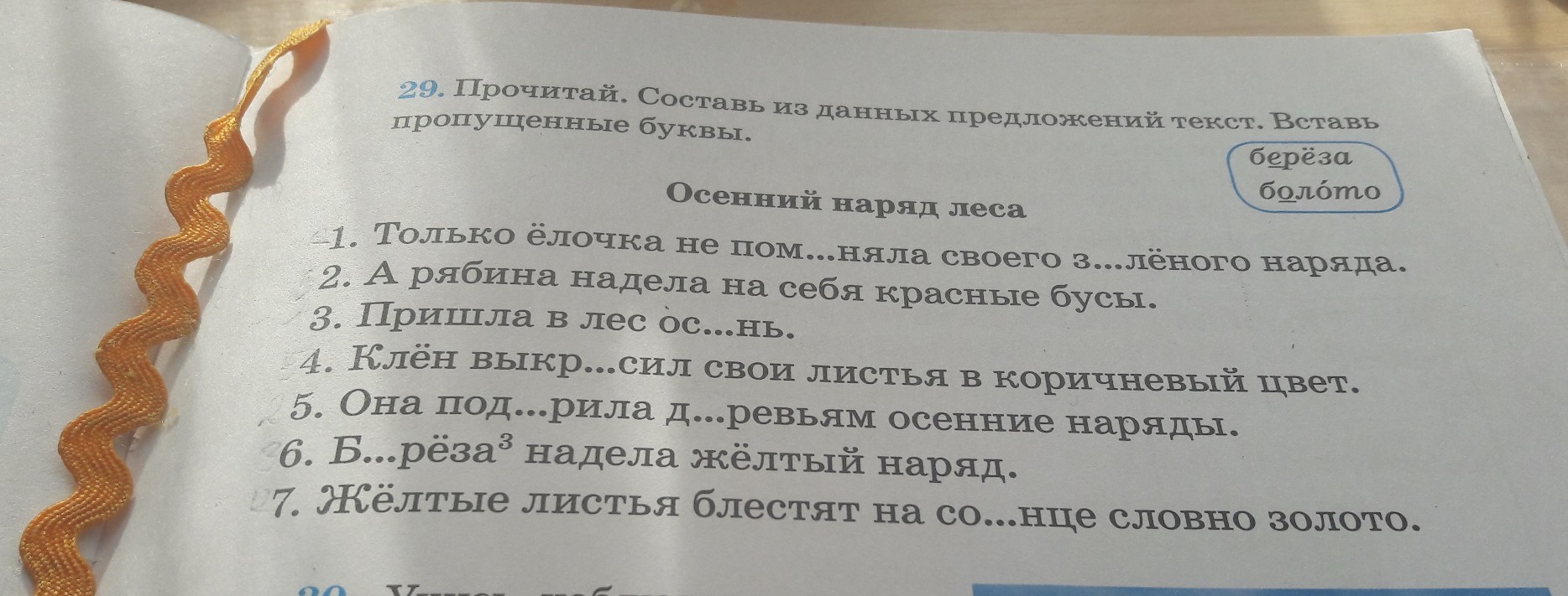 Пришла в лес осень.Она подарила деревьям осенние наряды.Берёза надела жёлтый наряд.Жёлтые листья блестят на солнце словно золото.Клен вырастил свои листья В коричневый цвет.только елочка не поменяла своего зелёного наряда.А рябина надела на себя красные бусы.