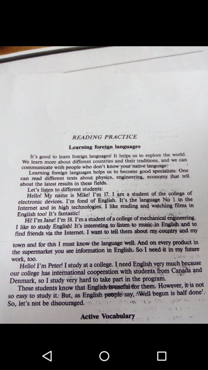 Выделение иностранных языков Хорошо учиться иностранным языкам Это помогает нам исследовать мир. Мы узнаем больше о разных странах и их традициях, и мы можем общаться с людьми, которые не знают, что ваш родной язык говорит на иностранном языке, помогает нам стать хорошими специалистами. Можно прочитать бесплатные тексты об инженерии, экономике, которая рассказывает о последних результатах в этих областях Давайте послушаем разных студентов: Привет! Меня зовут Майк! Мне 17 лет, я студент колледжа электронных устройств, я люблю английский. Это язык Нет Интернета и высоких технологий. Мне нравится читать и смотреть фильмы на английском языке! Это невероятно! колледж машиностроения Hirm Мне 18. Я студентка, я люблю изучать английский! Интересно послушать uo musicin на английском и найти друзей через Intemet. Я хочу рассказать им о моей стране и моем городе, и для этого я должен знать язык, и на каждом продукте в супермаркете вы видите информацию на английском языке, поэтому мне это нужно и в моей будущей работе. Здравствуйте! Я Питер! Я учился в колледже, мне нужен английский язык, потому что наш колледж имеет международное сотрудничество со студентами из Канады и Дании, очень усердно участвую в программе. Это не эти ученики знают, что англичане их расценивают. Однако, так легко изучить его. Но, как говорят англичане, MWell начался наполовину ». Итак, давайте не будем разочарованы. Активный Словарь