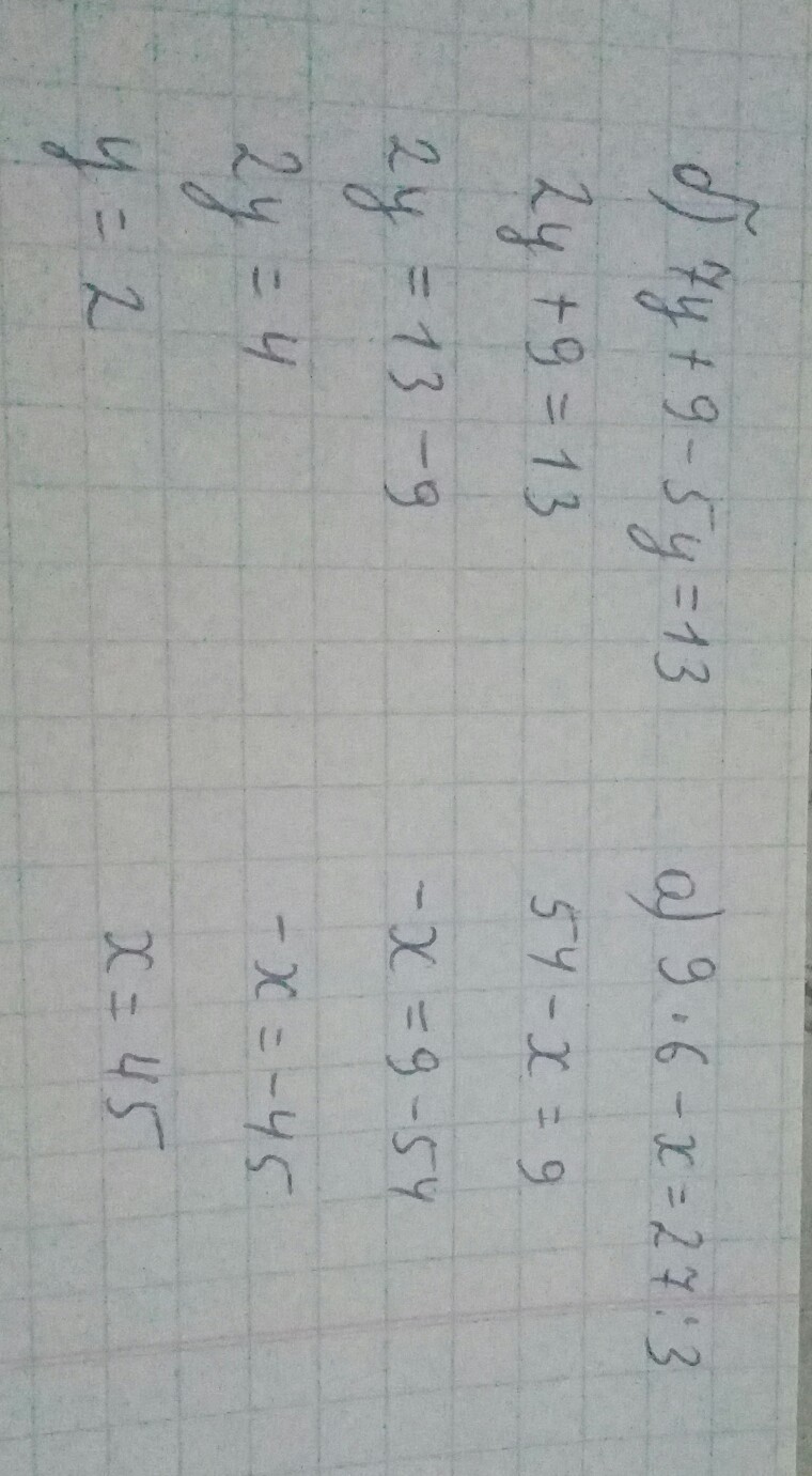 Решите пожалуйста вот эти уравнения. Так как только начались эти долгожданные дни, я чуть забыла про уравнения) а) 9*6 - x = 27:3 Б) 7у + 9 - 5у = 13.
