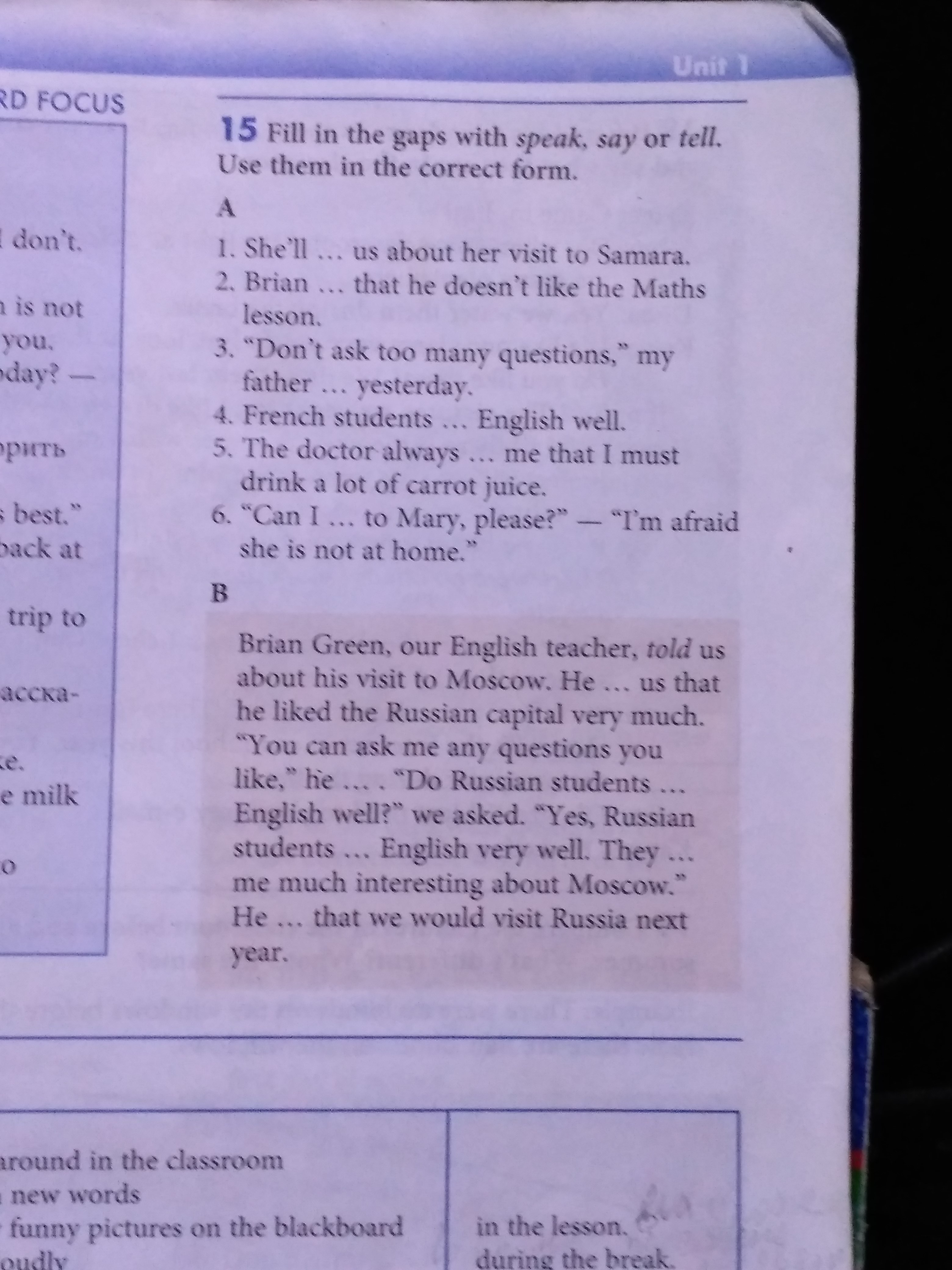 Brian Green, our English teacher, told us about his visit to Moscow. He told us that he liked the Russian capital very much. "You can ask me any questions you like," he said. "Do Russian students speak English well?" we asked. "Yes, Russian students speak English very well. They told me much interesting about Moscow." He said that we would visit Russia next year.