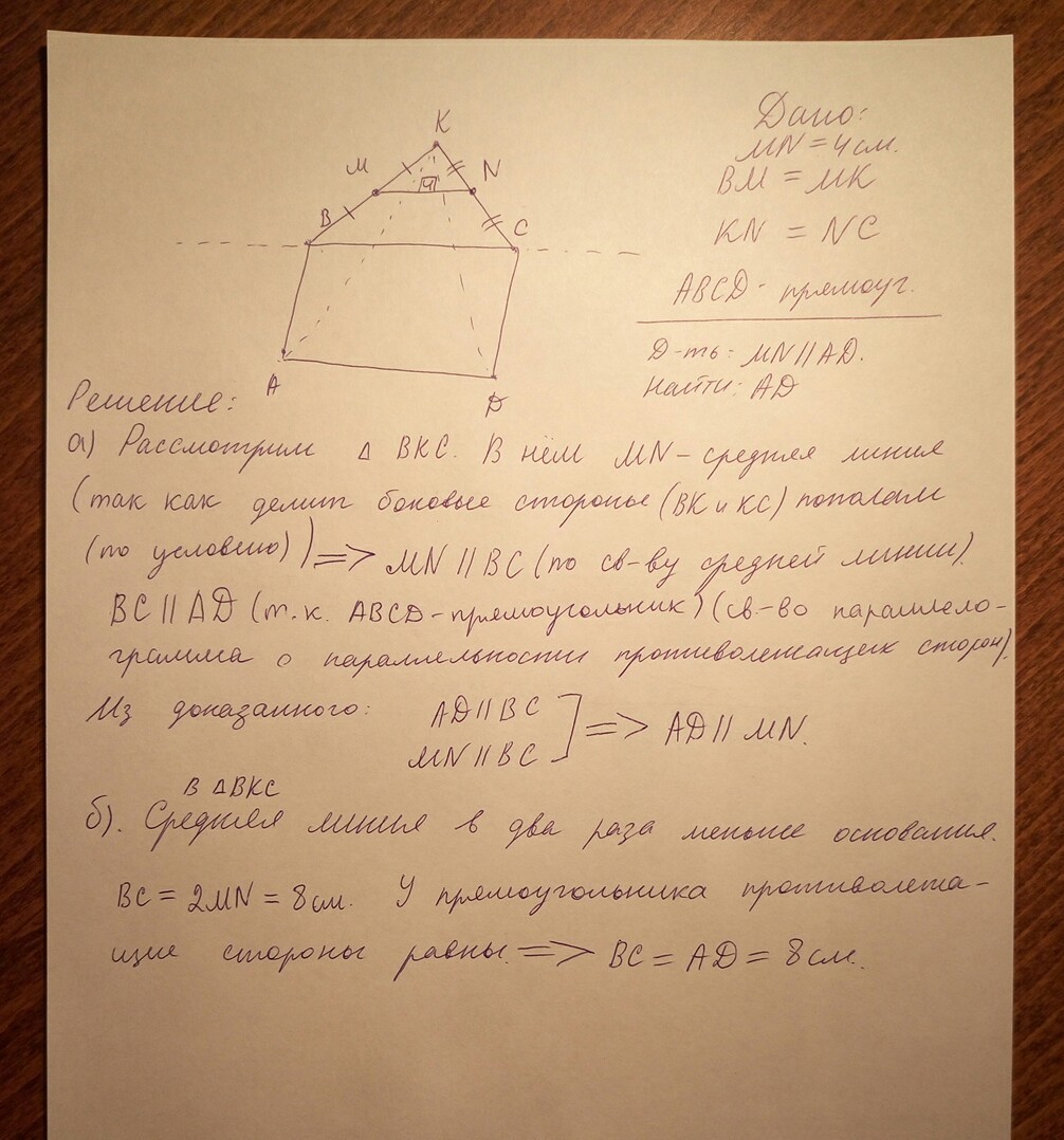 треугольник ВКС и прямоугольник АВСД не лежать в одной плоскости М середина ВК N середина КС