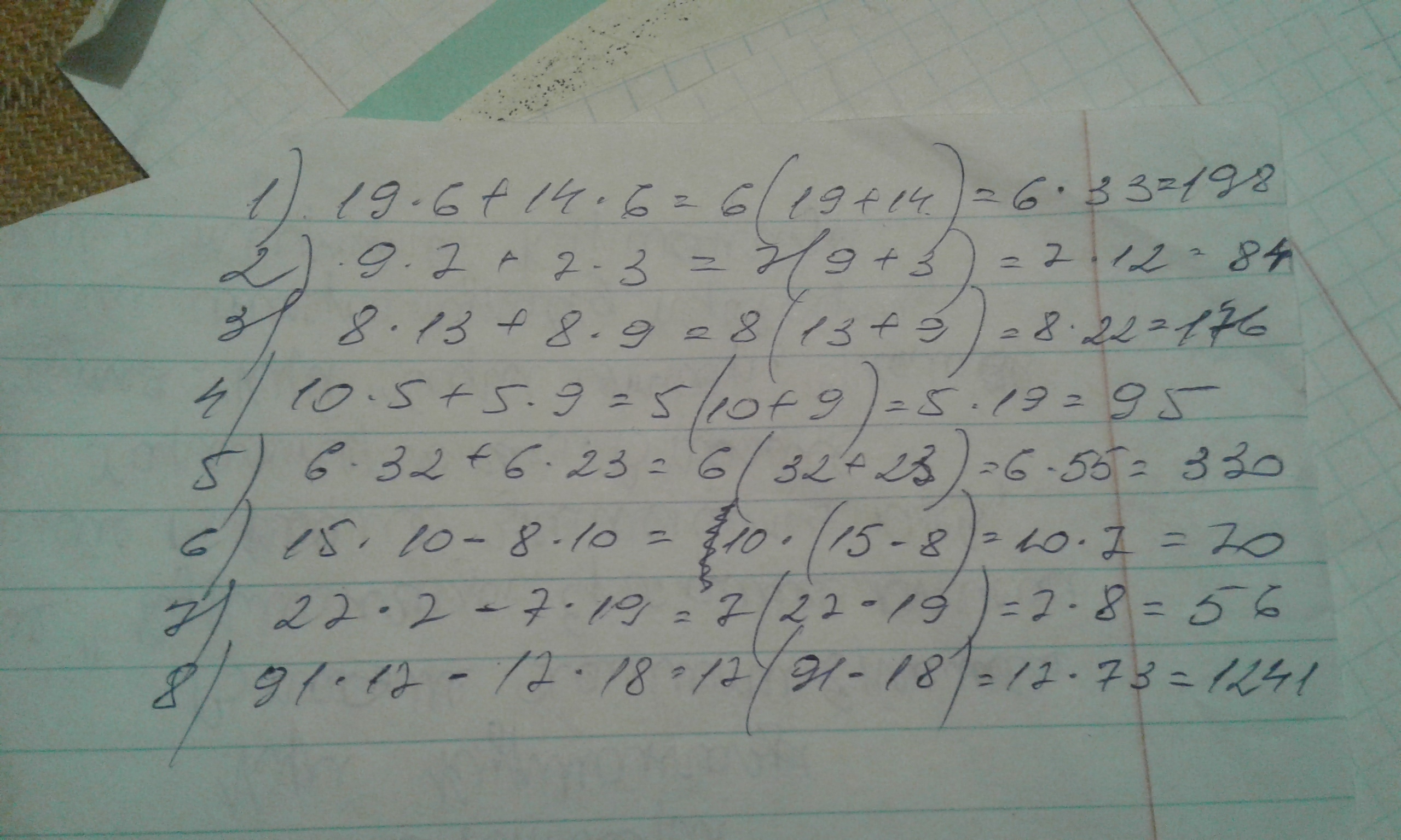 Помогите пожайлуста! Вынеси общий множитель за скобки в выражениях: 1) 19*6+14*6 2)9*7+7*3 3)8*13+8*9 4)10*5+5*9 5)6*32+6*23 6)15*10-8*10 7)27*7-7*19 8)91*17-17*18