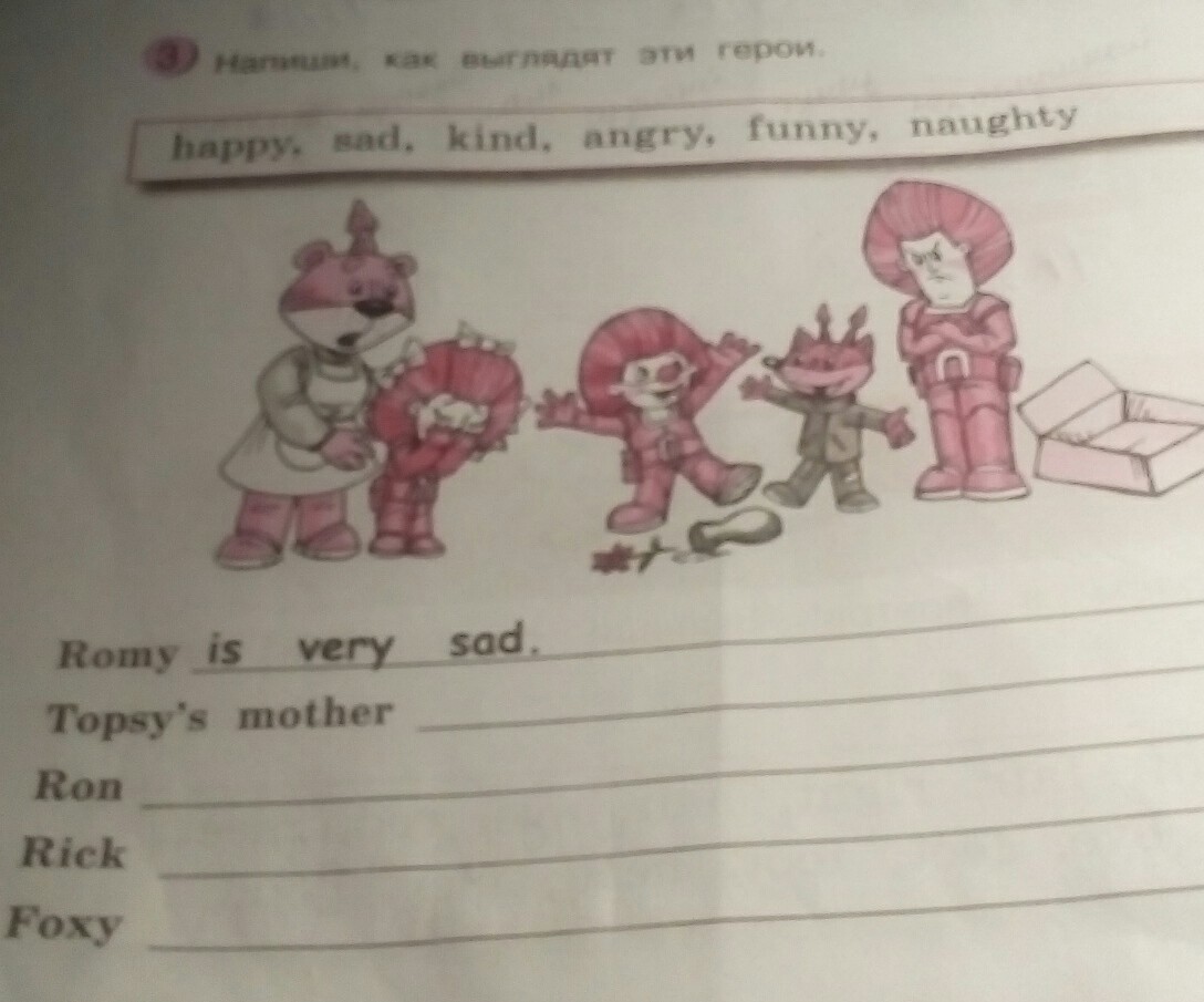 Напиши ,как выглядит эти герои .happy,sad ,kind,angry,funny,naughty. 1) Romy is very sad ....... 2) Topsy's mother ....3) Ron.......4) Rick.......5) Foxy....