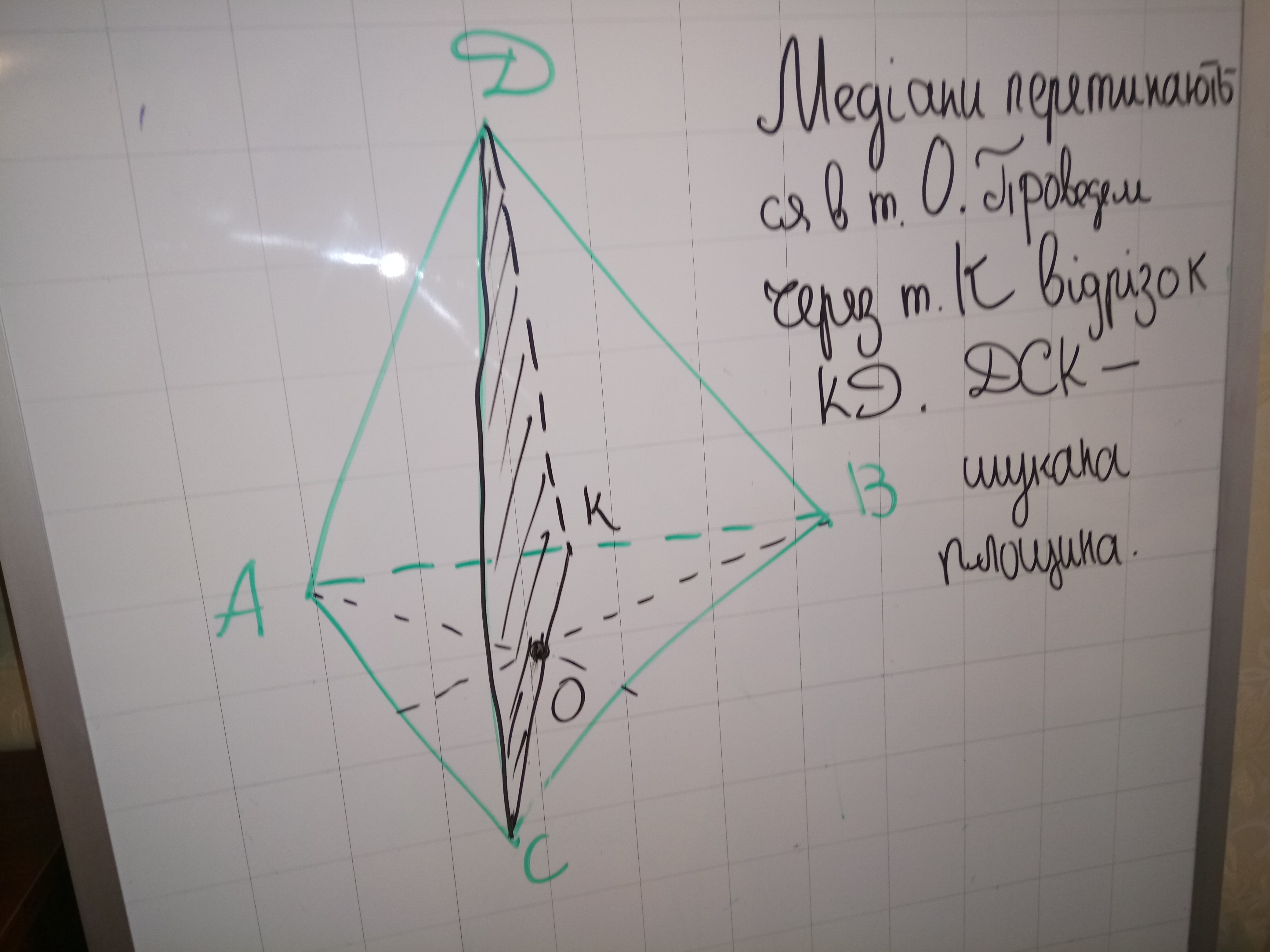 Побудувати переріз піраміди АВСD площиною яка проходить через ребро DC і точку перетину медіана грані АВС