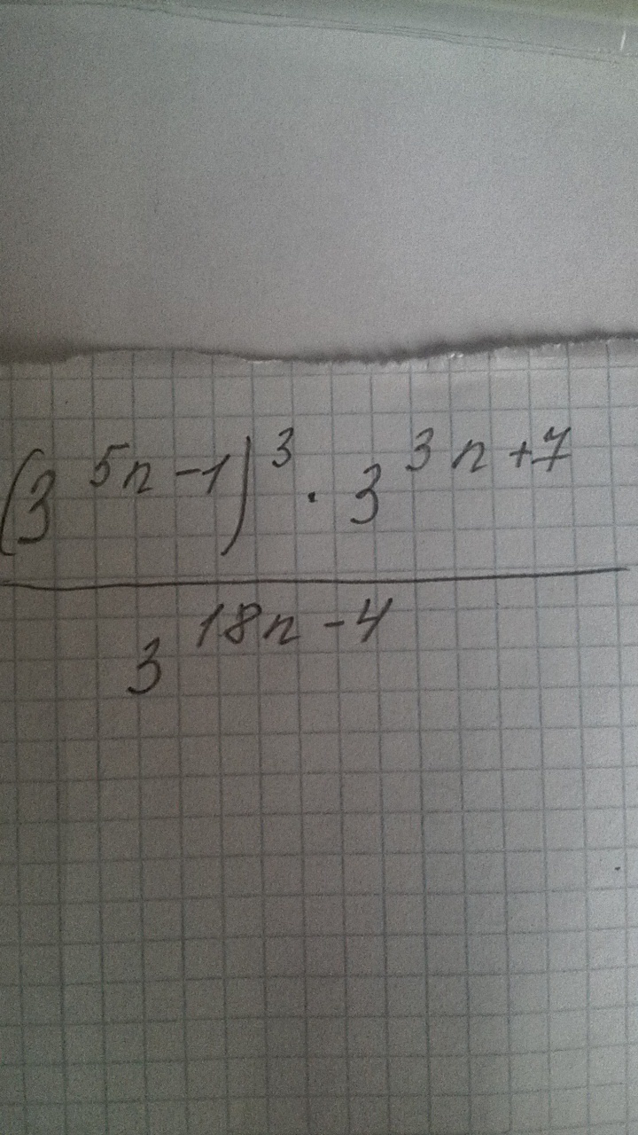 = frac{ 3^{15n-3+3n+7} }{ 3^{18n-4} } = frac{ 3^{18n+4} }{ 3^{18n-4} }= frac{ 3^{18n}* 3^{4}  }{ frac{ 3^{18n} }{ 3^{4} } }= 3^{4} * 3^{4}= 3^{8}
