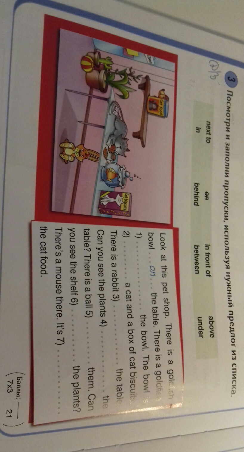 1) in 2) between 3) under 4) next to 5) in front of 6) above 7) behind