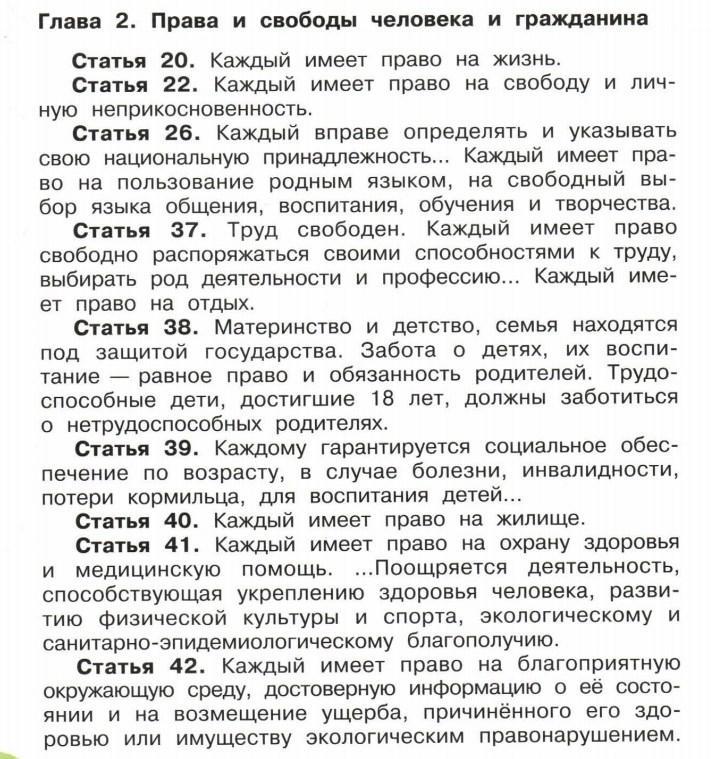 Права: право на жизнь;право на свободу и личную неприкосновенность; право указывать свою национальную принадлежность,пользоваться родным языком; право на труд,на свободный выбор рода деятельности и профессии; право на отдых; право родителей заботиться о своих детях и воспитывать их; право на социальное обеспечение по возрасту или ввиду жизненных обстоятельств; право на жилище; право на охрану здоровья и медицинскую помощь; право на благоприятную окружающую среду,информацию о её состоянии и возмещение ушерба в случае экологического правонарушения; право на образование; право на свободное творчество и преподавание; право на участие в культурной жизни и пользование объектами культуры.