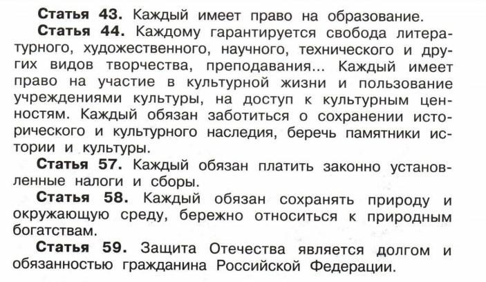 Обязанности: обязанность родителей заботиться о своих детях и воспитывать их; обязанность совершеннолетних детей заботиться о нетрудоспособных родителях; обязанность сохранять культурное и историческое наследие,беречь памятники культуры и истории; обязанность платить налоги и сборы; обязанность сохранять природу; обязанность защищать Отечество -- Российскую Федерацию.