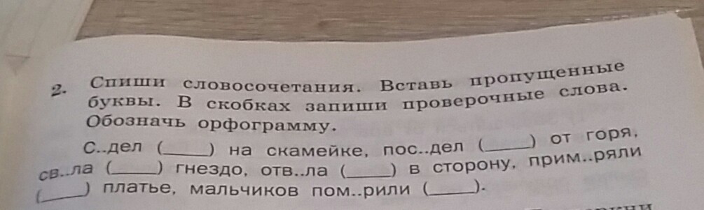 сидел (сИдя) на скамейке, поседел (сЕд) от горя, свила (вИть) гнездо, отвела (вЁл) в сторону, примеряла (мЕрить) платье, мальчиков помирили (мИр)