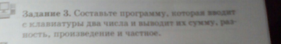 составьте программу,которая выводит с клавиатуры два числа и выводит их сумму,разность,произведение и частное