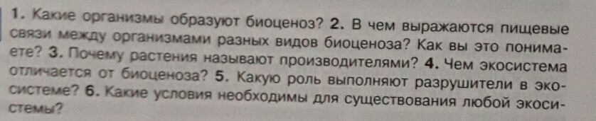 1. Зависимые друг от друга организмы, населяющие участок суши или водоема. 2. В каждом биоценозе есть 3 группы: производители (растения), потребители (хищные, всеядные, растительноядные) и разрушители (плесневые грибы, почвенные черви, бактерии и т.д.). Все они зависят друг от друга. Если не будет производителей - не будет потребителей (нет пищи), а разрушителям нечего разрушать. И с другими по аналогии. 3. Растения - автотрофы, фотосинтетики, то есть они могут с помощью фотосинтеза обеспечивать себя энергией и вырабатывать кислород, вне зависимости от того есть готовые органические вещества в почве или нет. 4. Экосистема - более широкое понятие. Экосистемой можно назвать и небольшой лес, и огромные территории + в экосистеме может не быть такой сильной зависимости организмов друг от друга, как в биоценозе. Биоценоз - совокупность организмов, населяющих территорию с ОДНОРОДНЫМИ условиями. 5. Уничтожают уже мертвые органические вещества, перерабатывая их для продолжения круговорота веществ. 6. Главные: круговорты веществ и энергии, многообразие организмов.