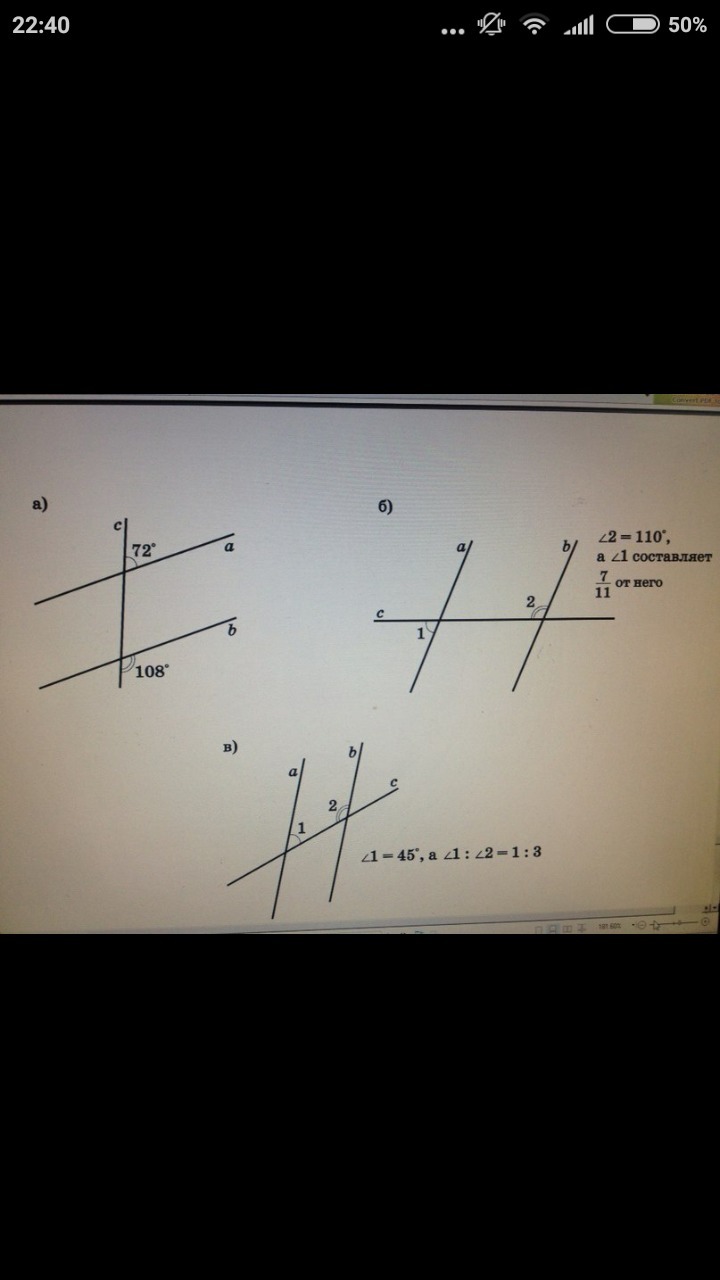 Прямые параллельны, если при пересечении двух прямых секущей : а) соответственные углы равны ( у тебя это первое задание, угол, смежный с углом в 108 градусов равен 72, и он соответственный и они равны) б) сумма односторонних равна 180 ( вторая задача- угол 7/11 равн 70 градусов и вертикальный с ним угол тоже равен 70 и они односторонние с углом в 110 градусов) , третью не знаю как решать)