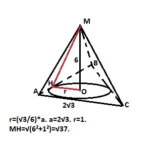 точка M рівновіддалена від кожної сторони правильного трикутника зі стороною 2корінь з 3 см. Знайти цю відстань, якщо точка М віддалена від площини трикутника на корінь з 6.
